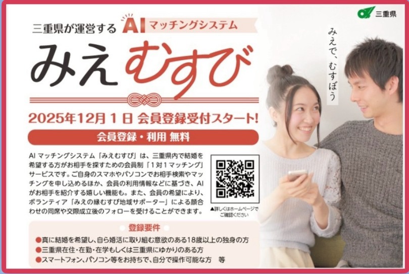 三重県が婚活をぐっと後押しする新しい取り組みAIマッチング「みえむすび」が始まります。💞